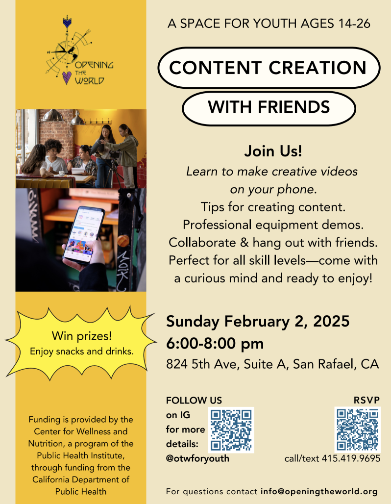 Learn to make creative videos on your phone. Tips for creating content. Professional equipment demos. Collaborate and hang out with friends. Perfect for all skill levels—come with a curious mind and ready to enjoy!